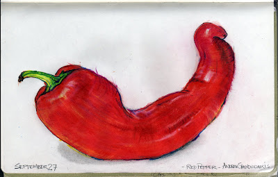 Not sure what will be next, I am thinking about letting the peppers dry and shrivel and then perhaps draw them again. I'm getting ready to go to Chicago and will probably draw people at the airport again. Love doing that - makes me feel good to look back at the drawings. Remembering the people, the things they did while I drew them, as well as their nuances while I secretly observed them.